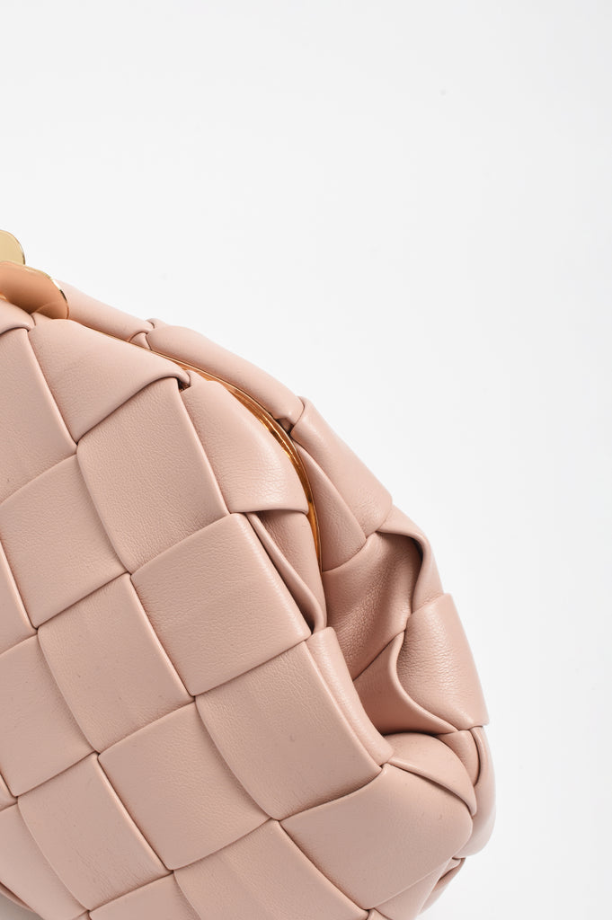 The Amelie Weave Clutch in Pink is crafted from woven vegan leather and finished with gold hardware, featuring an optional chain strap and internal zip pocket for elevated everyday styling.