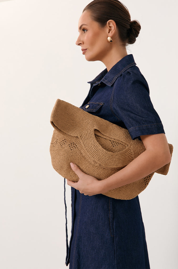 The Esta Diamond Weave Event Basket in Camel is a relaxed bucket-style bag crafted from paper weave, featuring top handles and textured diamond detailing for effortless, everyday styling.