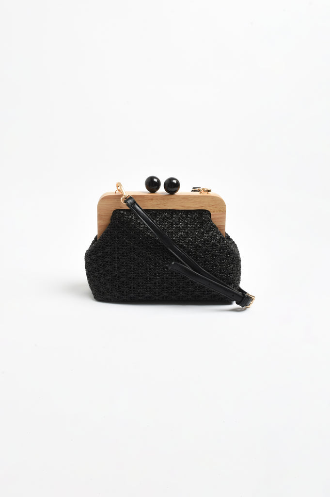 The Nelly Weave Timber Clutch in Black features a structured timber frame with a woven body. Designed with a magnetic closure, an internal zip pocket, and an optional leather strap. Sized to accommodate most smartphones.
