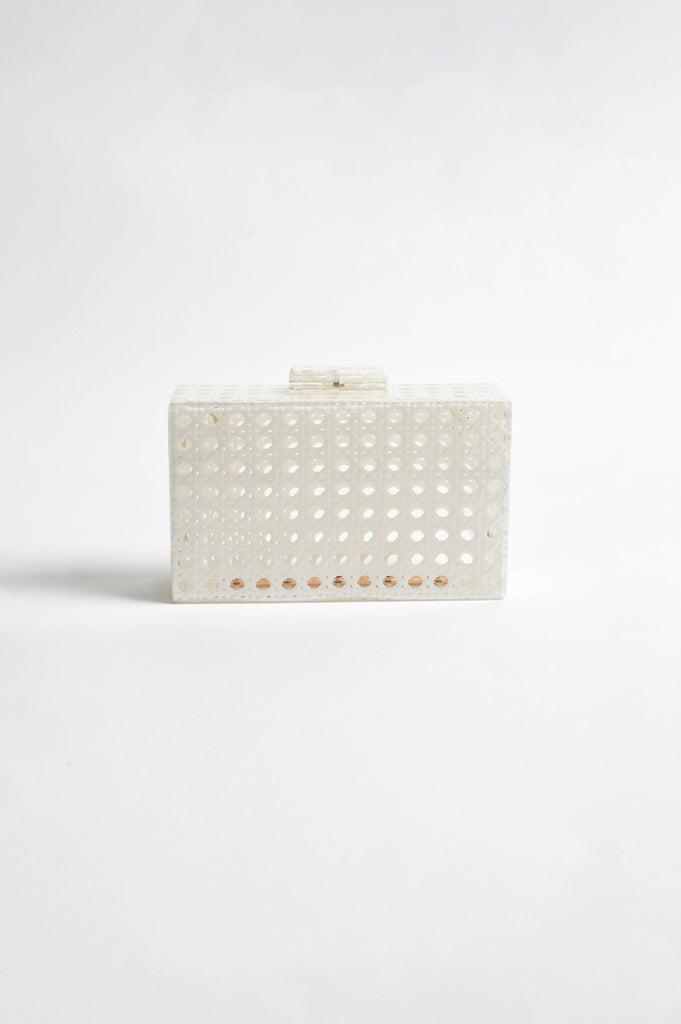 The Sadie Picnic Weave Clear Structured Clutch in White/Clear features a clear structured design with intricate weave detailing. Finished with a magnetic closure and an optional chain strap.