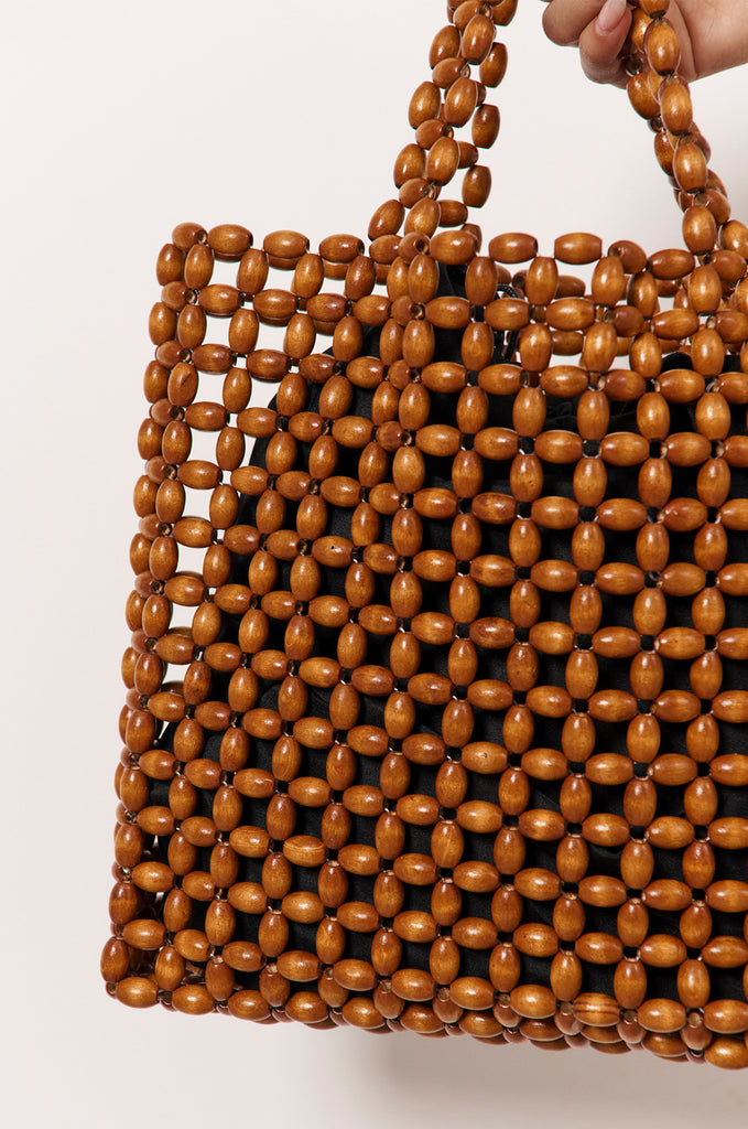 The Timber Beads Tote Bag in Tan is a beaded tote with two top handles and an open top. It comes with a removable cotton insert and is crafted from timber beads and cotton.