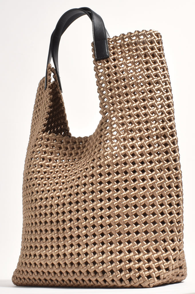 - Materials: Satin Fabric, Vegan Leather & Plated Metal