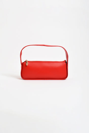 The Baguette Small Bag in Red features a sleek silhouette with a single shoulder strap and flat base. Designed with a zip closure and an internal zip pocket for added functionality.