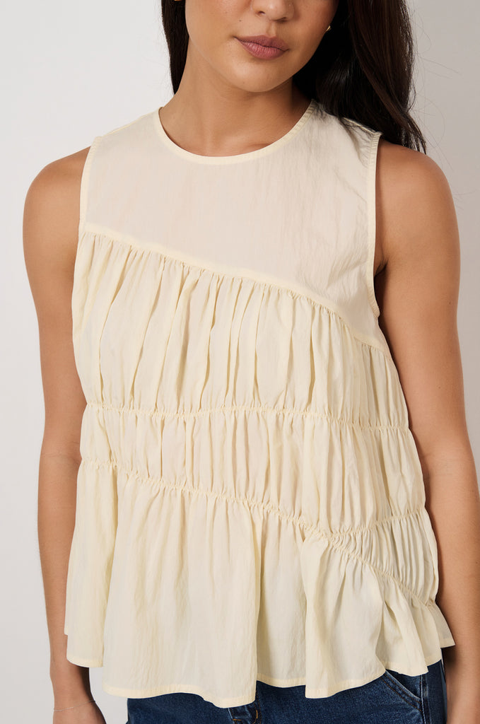 The Evren Cap Sleeve Top in Butter Yellow is made from a soft crinkle fabric. It features a round neckline, gathering through the bodice, and a relaxed silhouette.