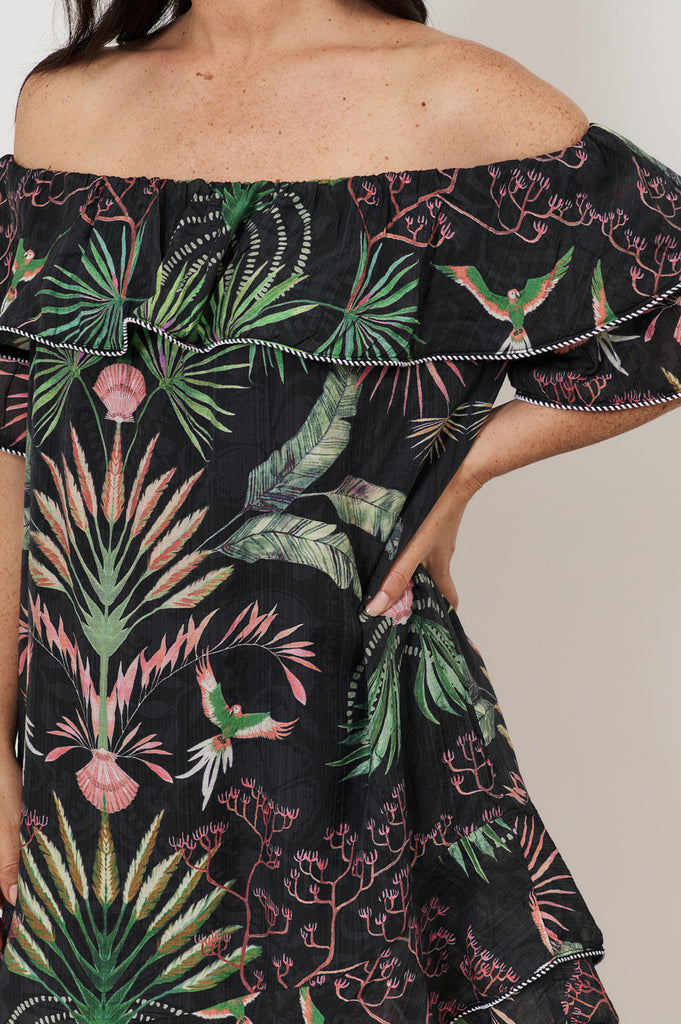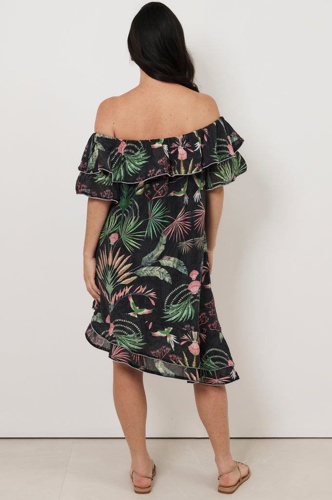The Havana Off Shoulder Frill Dress in Print features an off-shoulder neckline and a flowing asymmetric tiered hem. Detailed with frills and contrast piping, it’s crafted from a lightweight rayon nylon blend.