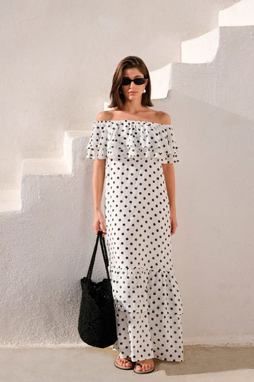 The Kalani Frill Maxi Dress (Spot) is crafted in an exclusive adorne print. Cut from a sheer, lightweight fabric with internal lining, it features frills through the bodice, a tiered hem, and an off-shoulder neckline. Sleeves can be styled three ways: off the shoulder, one-shoulder, or on the shoulders.