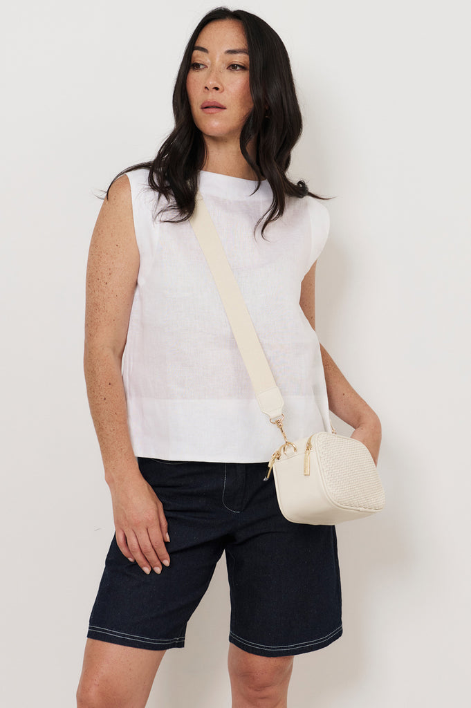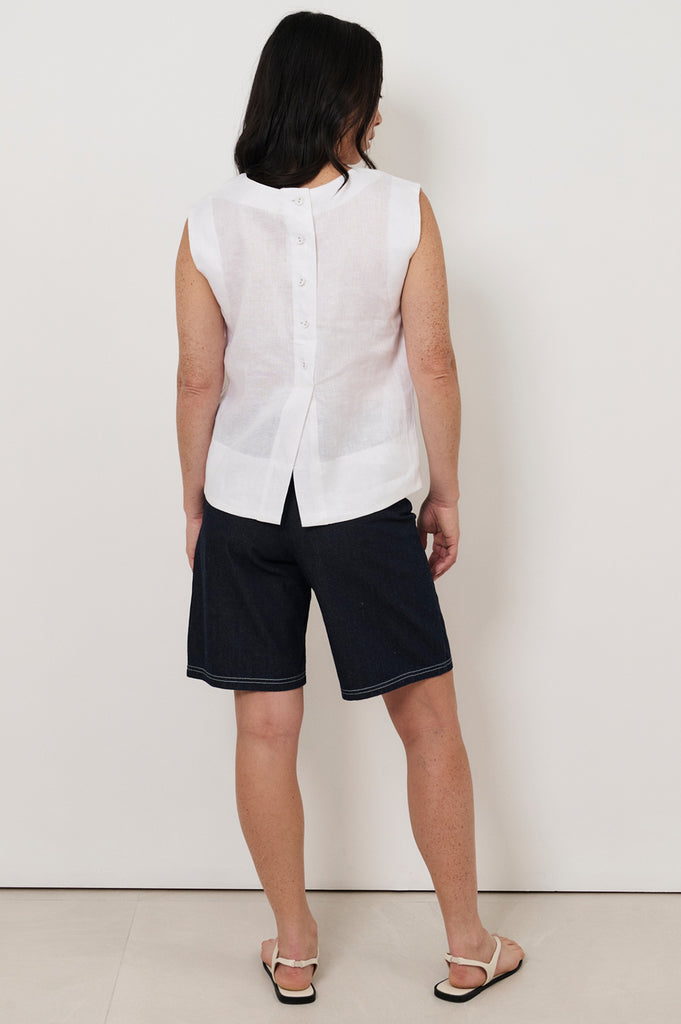 The Kita Linen Button Back Top in White is a sleeveless shell style crafted from 100% linen. Featuring a round neckline, it’s finished with button-back detailing and a back split for a relaxed, refined look.