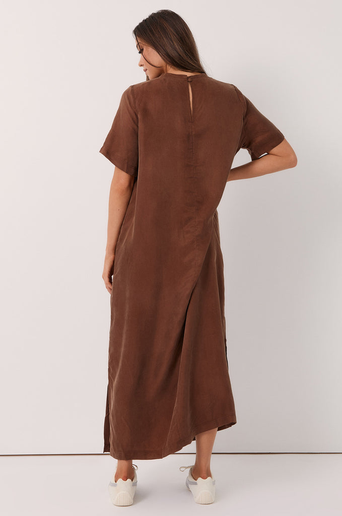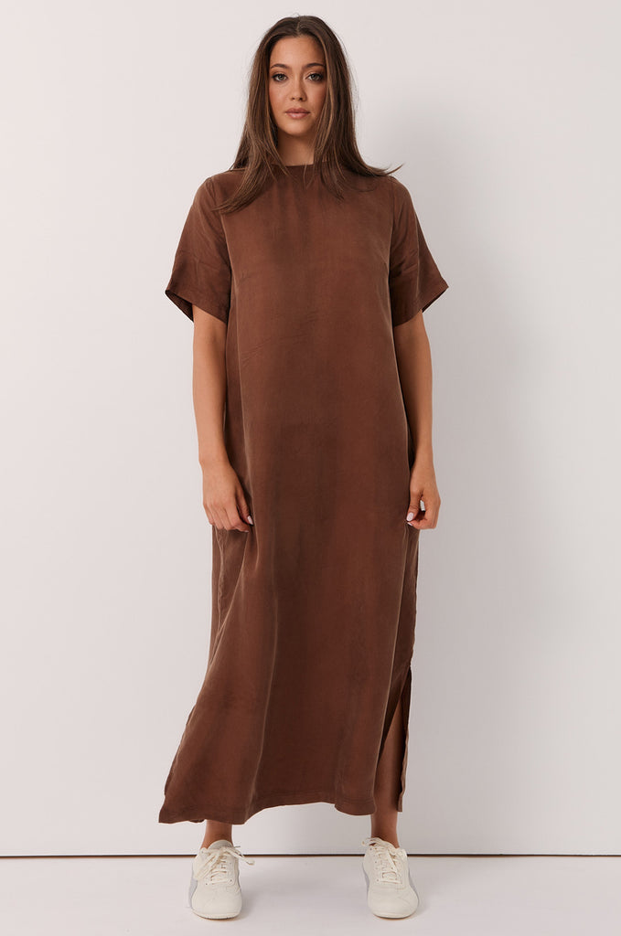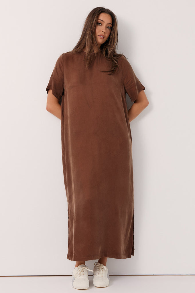 The Ryan Cupro Maxi Dress in Chocolate is crafted from a soft cupro-viscose blend in a oversized silhouette. Designed with a round neckline, short sleeves, and a side split, it’s an effortless piece for day-to-night wear.