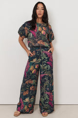 The Santori Seville Print Top in Print features an exclusive Adorne print with short puff sleeves and exposed seam detailing. Designed with a button-and-loop back closure, it is unlined and crafted from a soft blend of 70% rayon and 30% nylon.