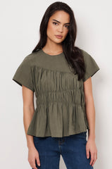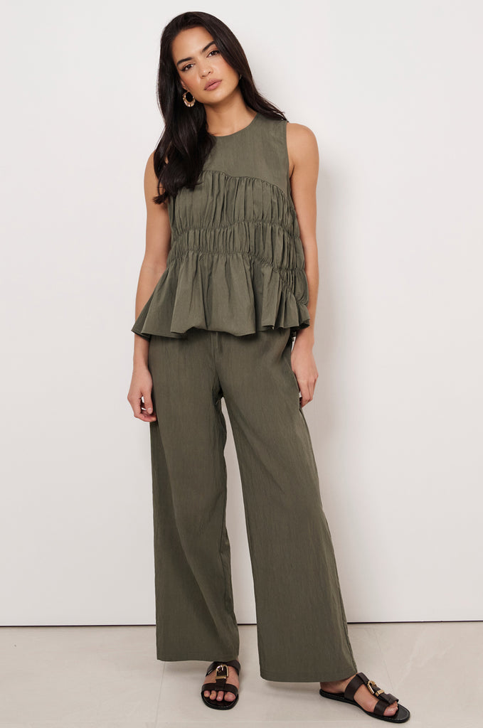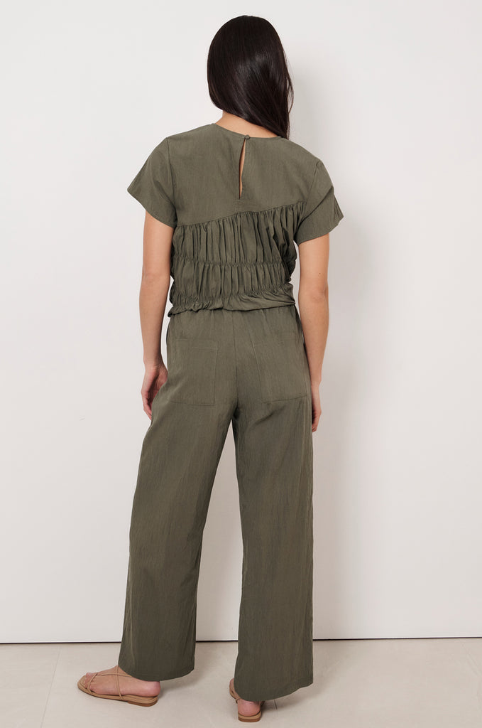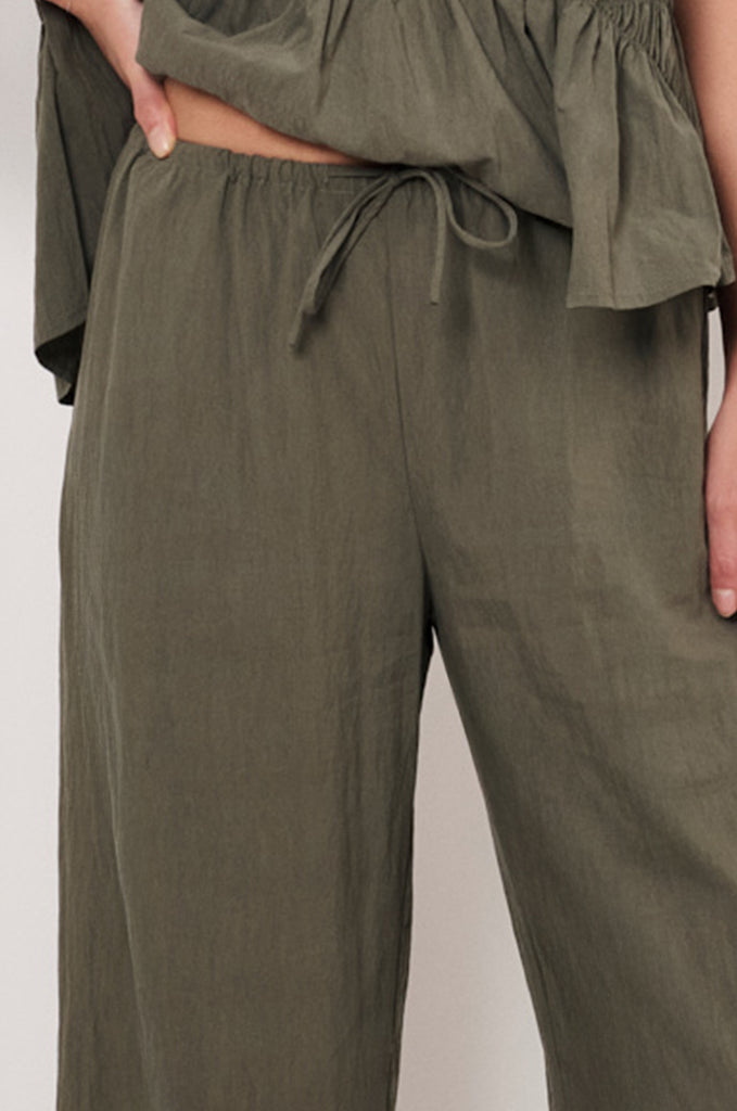 The Stevie Pant in Khaki is cut from a soft crinkle fabric with a relaxed straight leg. Finished with a drawstring waistband and side seam pockets.