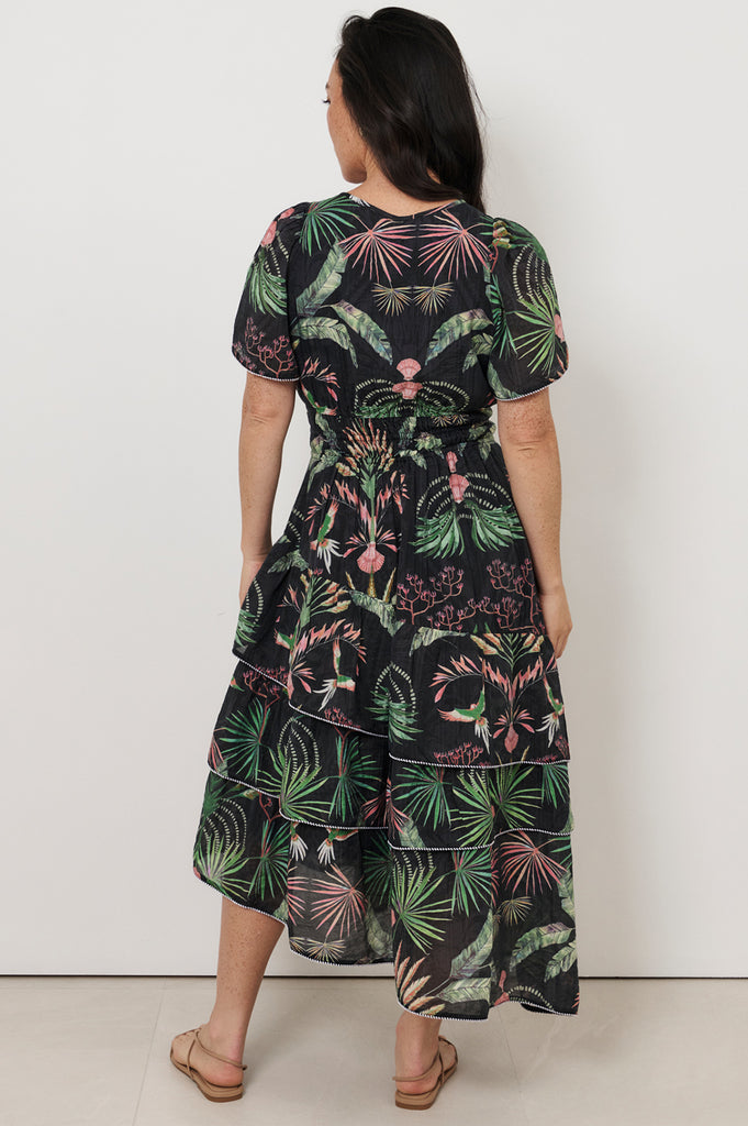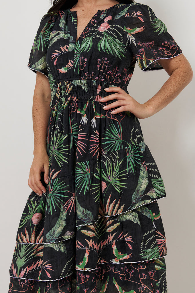The Tahnee Asymmetric Frill Dress in Print features an exclusive adorne print and a flattering ruched waist. Designed with a mandarin collar, V-neckline, and short sleeves, it’s finished with contrast piping and an asymmetric tiered hem.