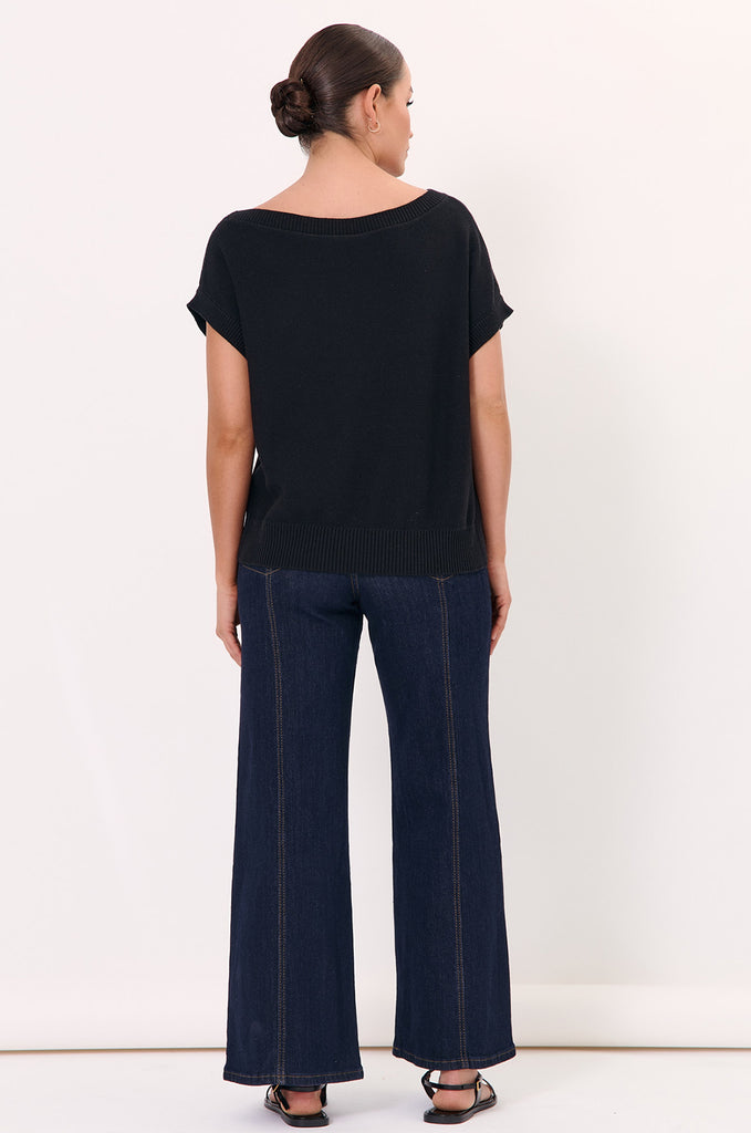 The Terrie Angled Neckline Cotton Knit Top in black is cafted from 100% cotton in a relaxed silhouette. Designed with an angled boat neckline and ribbed trims, it’s an easy, lightweight layer for everyday wear.