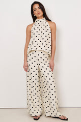 The Kendra High Neck Top in Spot is crafted from 100% linen with a soft cotton lining. Designed in a halter style with a high neckline, it features a polka dot print and a button-and-loop closure at the back.