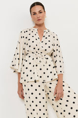 The Parker Wide Leg Pant features a polka dot print in a relaxed silhouette. Designed with side pockets and an elastic waist, it’s finished with a button and zip closure. Crafted from a lightweight blend of nylon, linen and rayon.