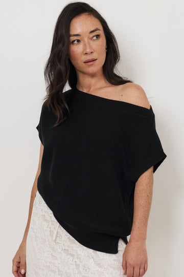 The Terrie Angled Neckline Cotton Knit Top in black is cafted from 100% cotton in a relaxed silhouette. Designed with an angled boat neckline and ribbed trims, it’s an easy, lightweight layer for everyday wear.