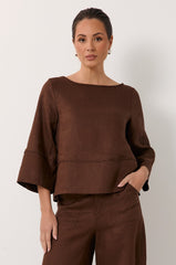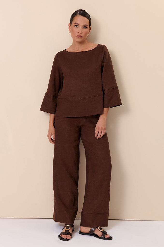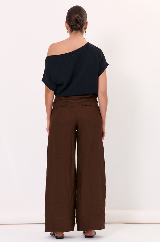 The Avalon Wide Leg Linen Pant is made from 100% linen in a chocolate hue. Designed in a wide-leg silhouette, it features a zip fly with button closure, belt loops, and front patch pockets. Finished with a double hem detail.