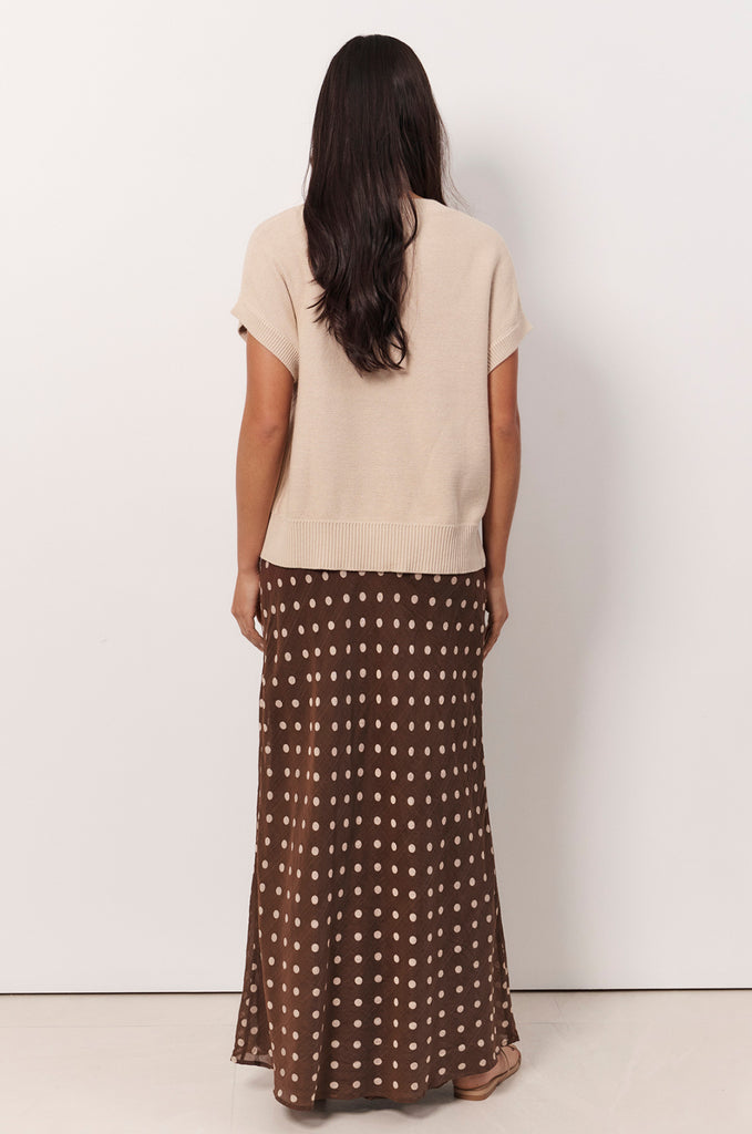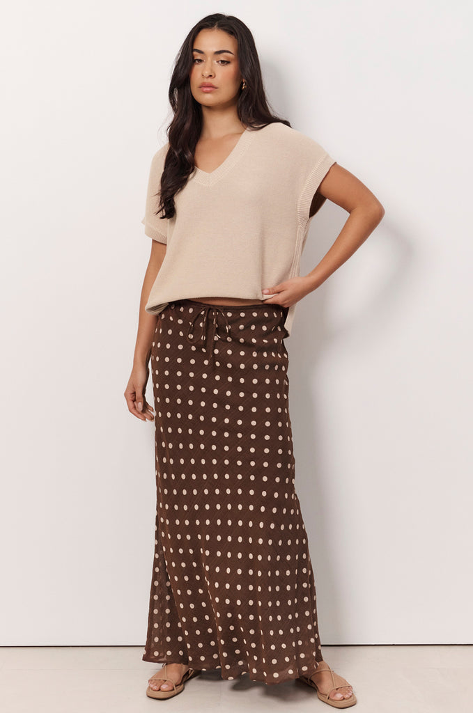 The Mae Maxi Skirt (Spot) is crafted from a sheer lightweight fabric with lining. It features an elasticated waistband with drawstring for a relaxed fit.
