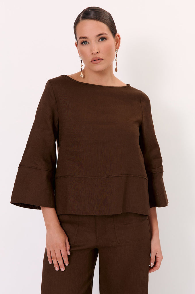 The Phoenix Linen Top is crafted from 100% linen in chocolate. It features a boat neckline, panelled hem sleeve detailing, and self-trim accents. Designed in a relaxed silhouette with side hem splits.