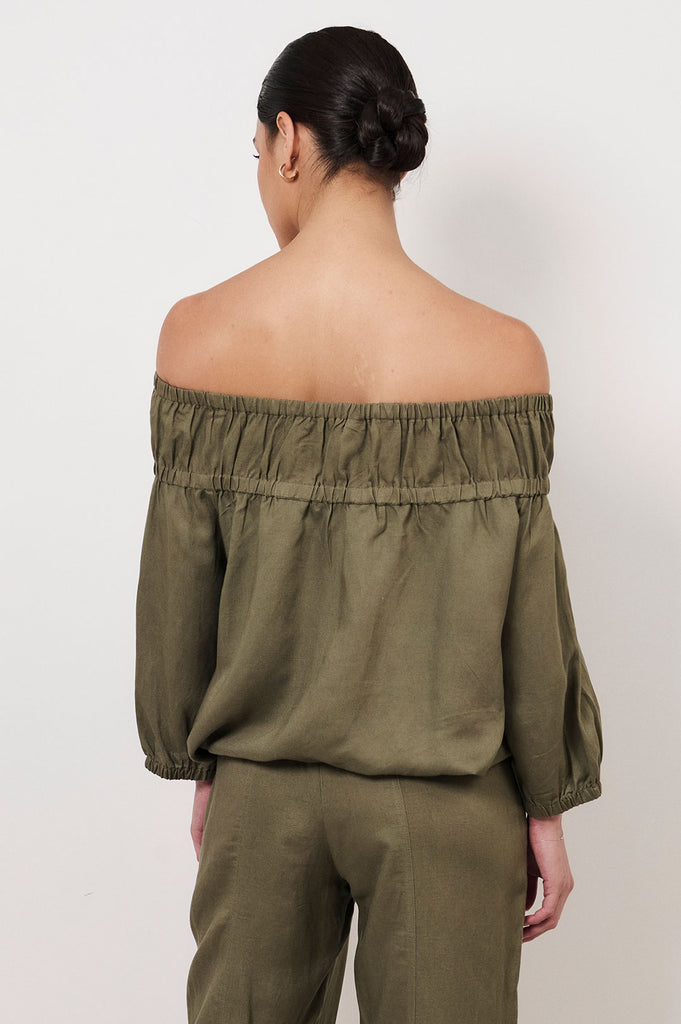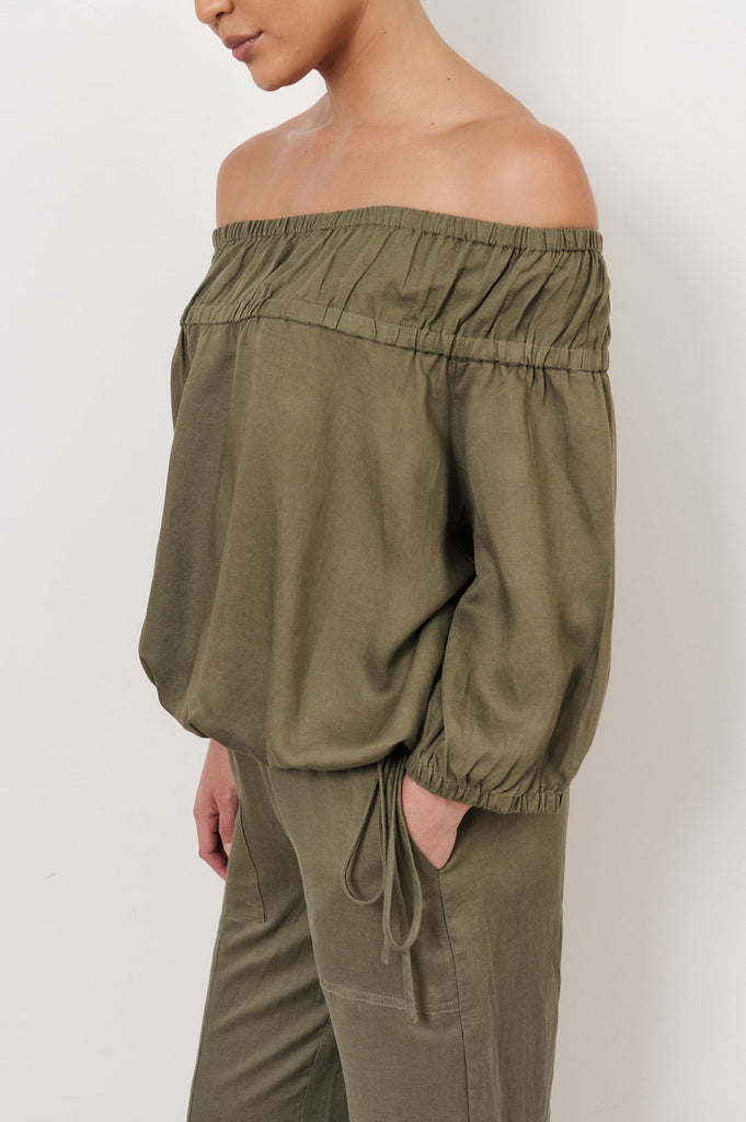 The Roma Off Shoulder Top in Khaki features a relaxed silhouette with an adjustable drawstring hem and three-quarter sleeves with elastic cuffs. Designed to be worn multiple ways: off the shoulder, one-shoulder, or on the shoulders.