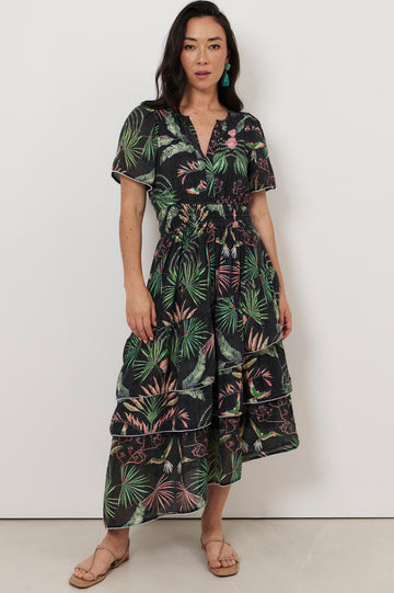 The Tahnee Asymmetric Frill Dress in Print features an exclusive adorne print and a flattering ruched waist. Designed with a mandarin collar, V-neckline, and short sleeves, it’s finished with contrast piping and an asymmetric tiered hem.