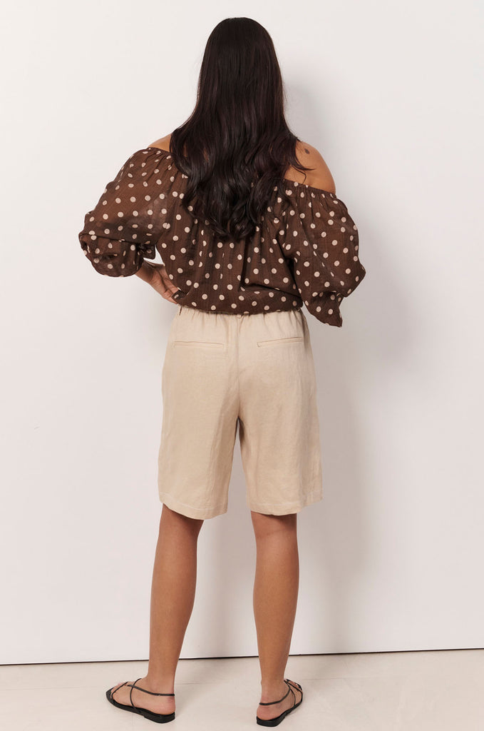 The Heidi Contrast Stitch Bermuda Short in Camel is made from 100% linen with a relaxed fit. Designed with contrast stitch detailing, it features an elasticised waist, front pockets, and a zip and button closure.