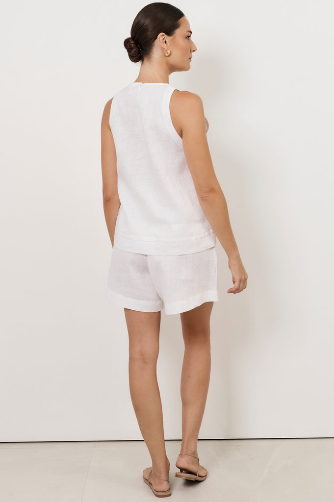 The Kensley Contrast Stitch Linen Top in White is crafted from 100% linen and finished with subtle contrast stitching. It features a round neckline, sleeveless design, and a loop-and-button back closure.