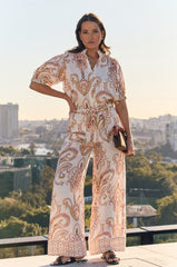 The Lilian Short Sleeve Linen Top is made from 100% linen in an exclusive adorne print. It features a mandarin collar, self-covered button-down front, and short sleeves with elasticated cuffs. Finished with a back yoke and a relaxed fit.