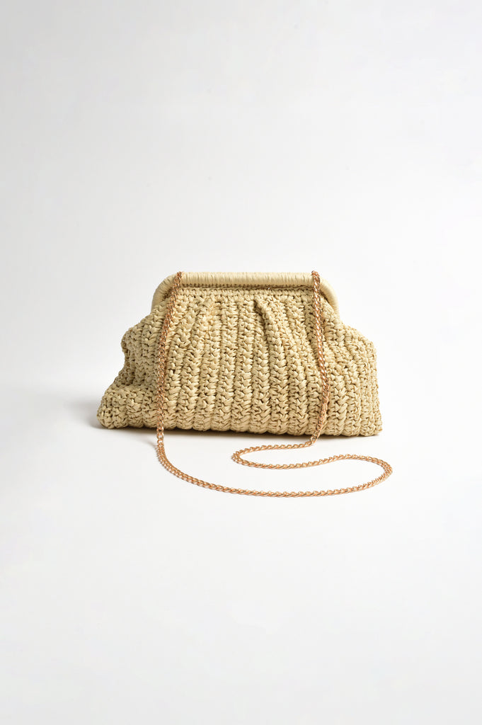 The Paper Weave Gathered Clutch in Natural is crafted from woven raffia with a textured exterior. Designed with a hinged frame closure, it includes an internal pocket and an optional chain strap.