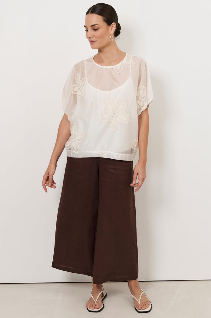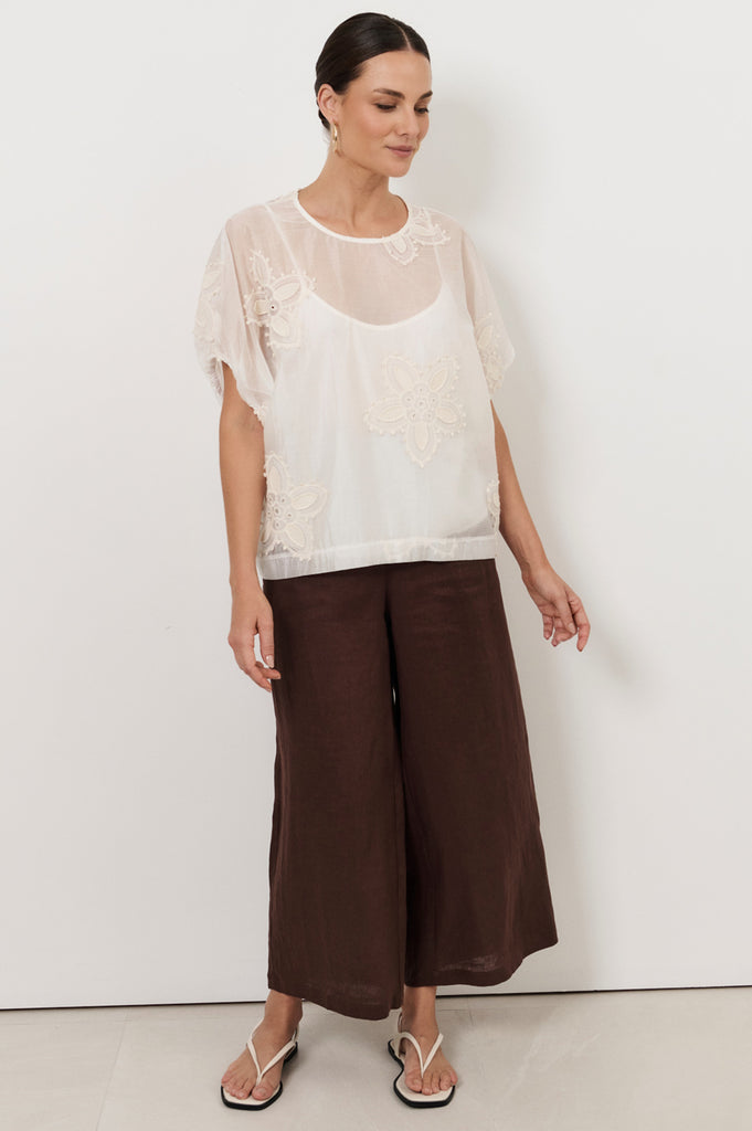 The Phoebe Appliqué Flower Top  in Ivory is crafted from delicate embroidered floral lace and comes with a separate camisole for coverage. It features a round neckline, dropped shoulders, and a button and loop closure at the back.