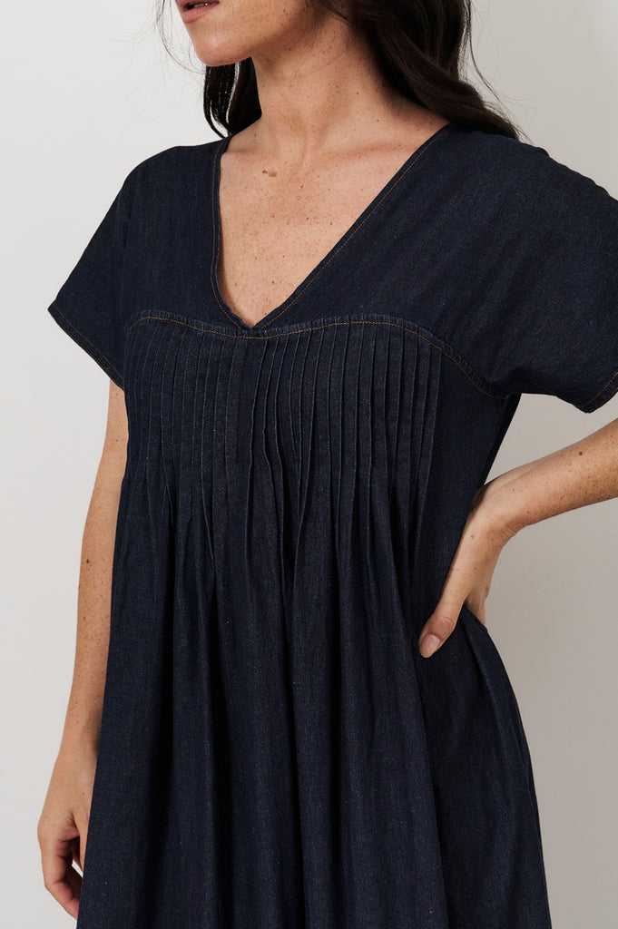 The Sidney Lightweight Denim Maxi Dress in Denim features a relaxed silhouette with a V-neckline and back. Crafted from soft, lightweight denim, it has short sleeves, contrast stitching, pintuck details, and a button-and-loop back closure.