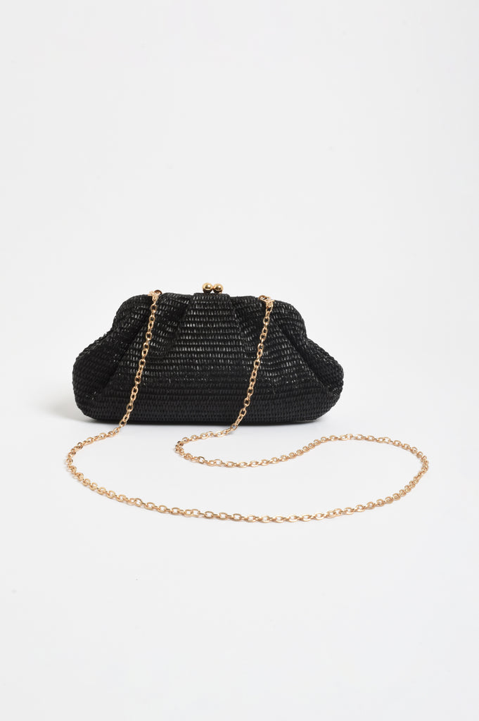 The Weave Gathered Clutch in Black features a gathered woven design with a metal clip closure. It includes an internal pocket and an optional chain strap. Crafted from man-made weave materials.