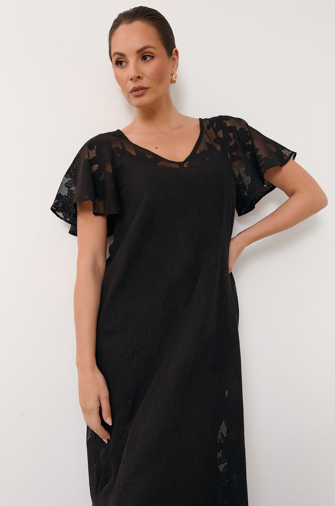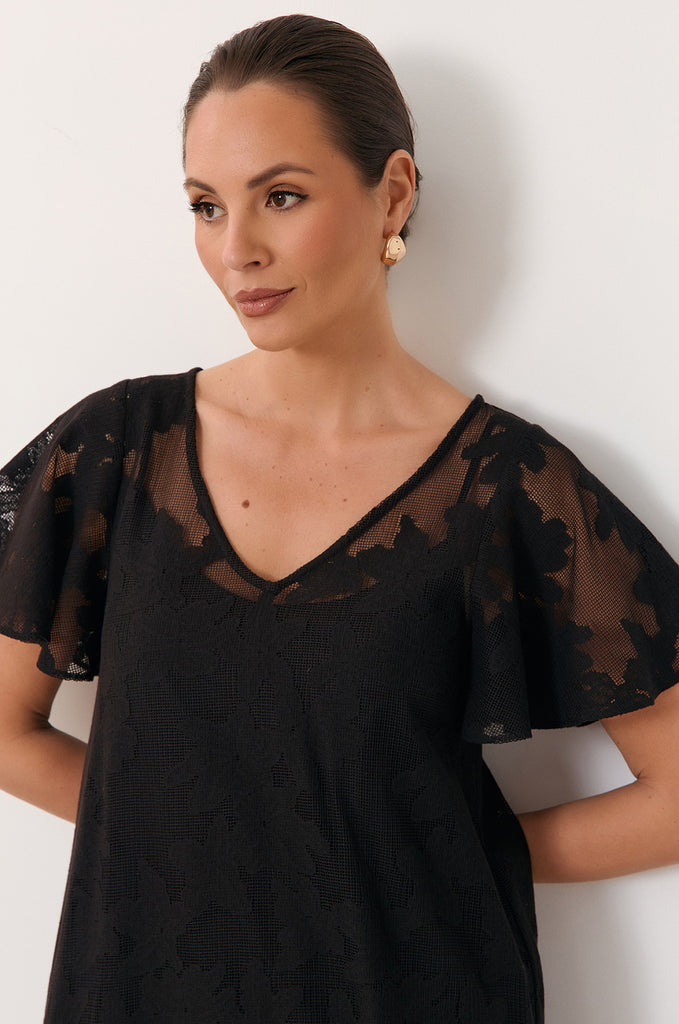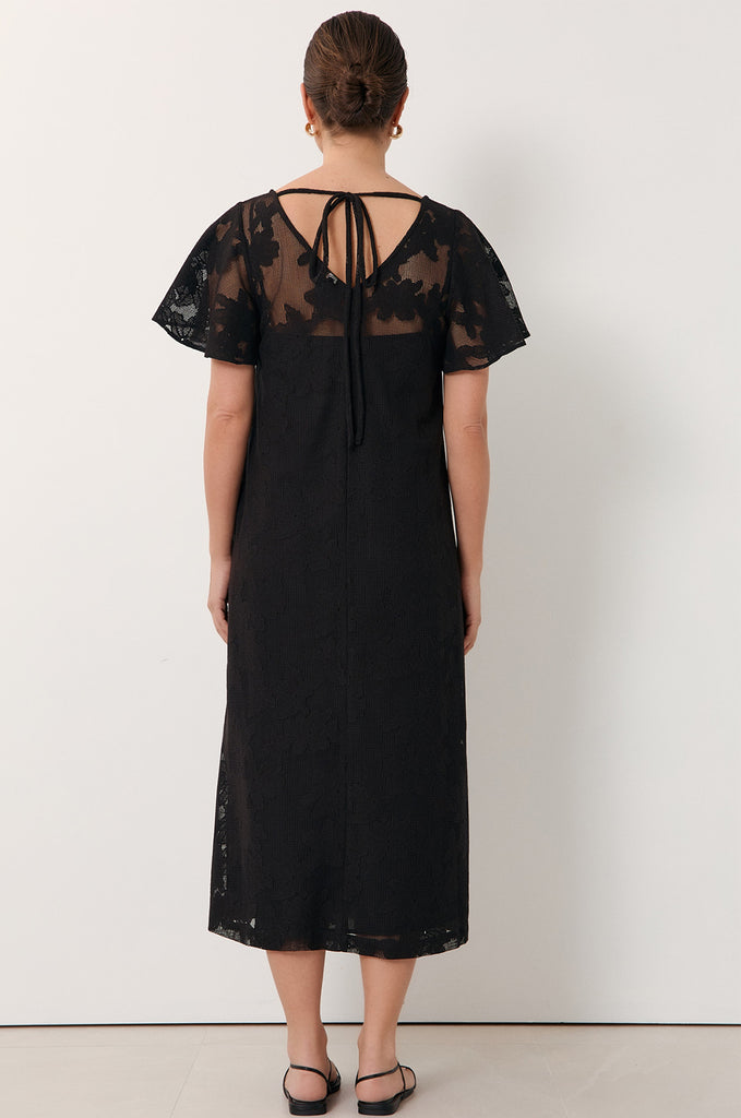 The Harlow Midi Lace Dress is made from a patterned lace blend in black. It features an open V-neckline, flutter sleeves, and a back neckline tie. Designed in a midi length and includes a slip for coverage.