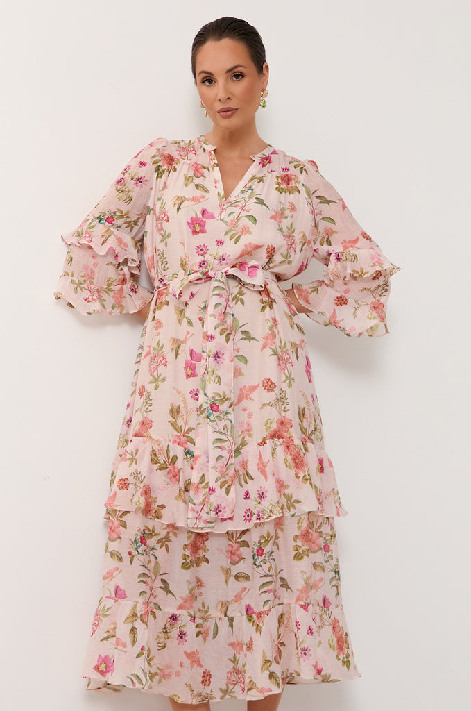 The Larissa Frill 3/4 Sleeve Dress in an exclusive adorne print is crafted from a rayon-nylon blend. It features a mandarin collar with a V-neckline, frill detailing, and a tiered hem. Finished with an optional self-tie waist belt.