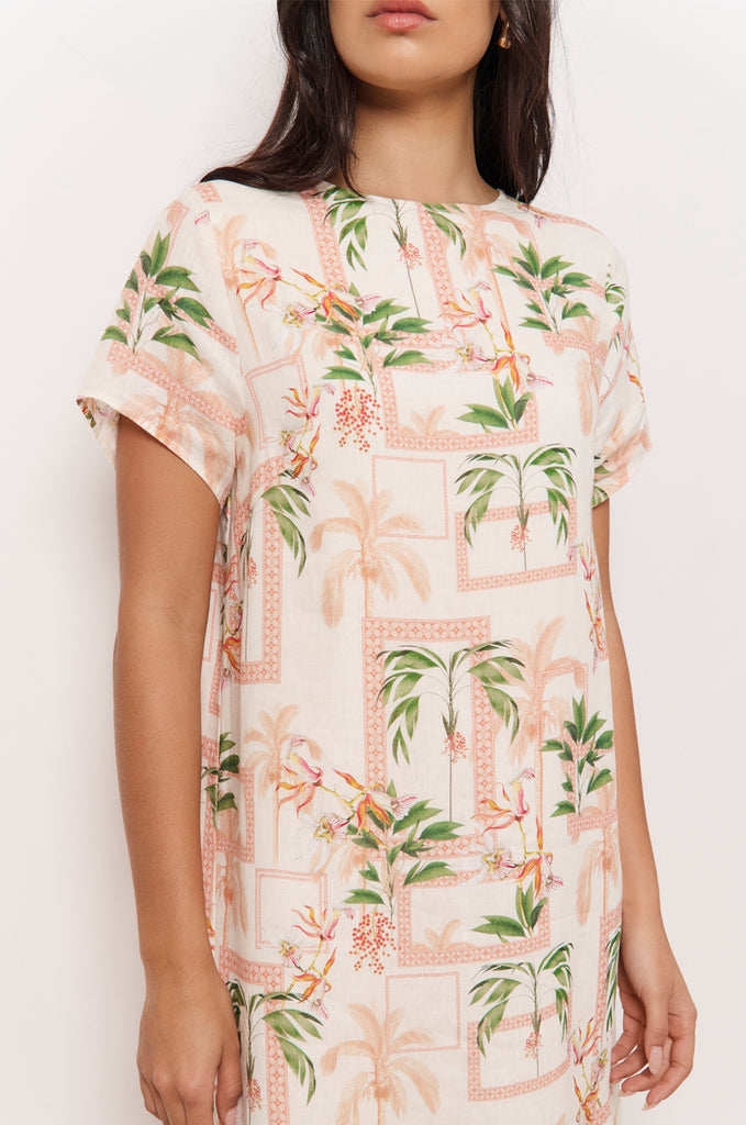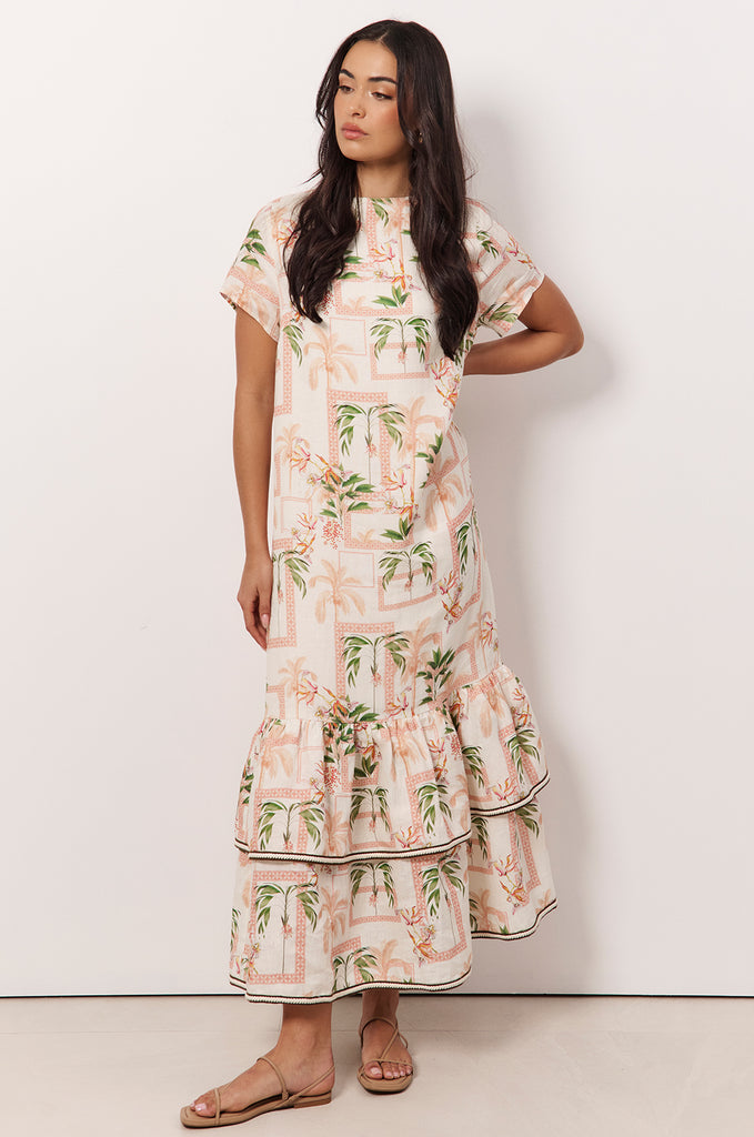 The Rio Linen Maxi Dress is cut from 100% linen in our exclusive adorne print. Designed with a relaxed silhouette, it features short sleeves, a round neckline and a tiered hem with contrast trim.
