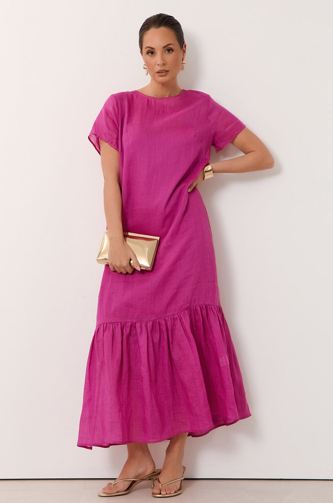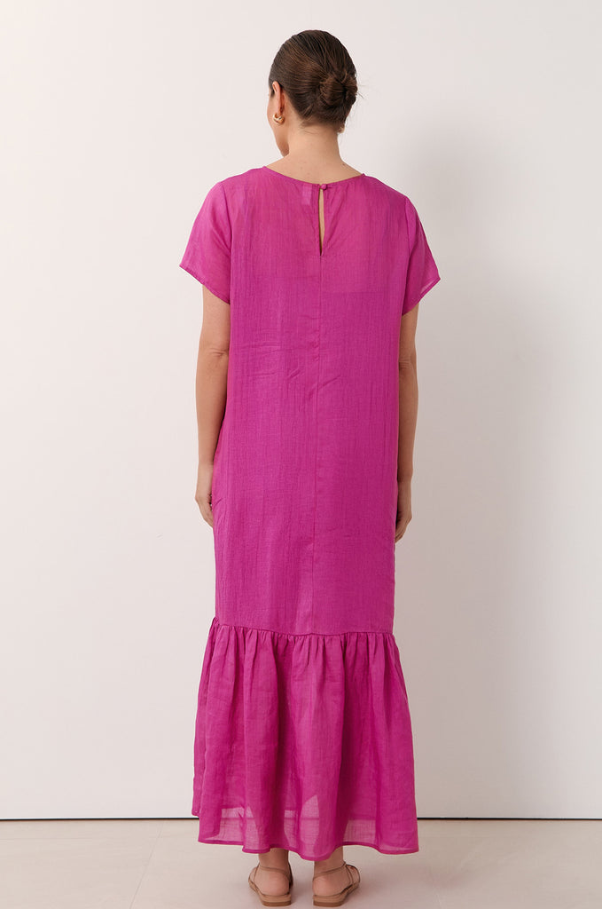 The Rio Ramie Maxi Dress in Magenta is crafted from sheer, lightweight 100% ramie. It features a high boat neckline, short sleeves, and a tiered hem.