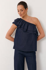 The Sabina Lightweight Denim Pant in Denim is crafted from a cotton blend in a wide-leg silhouette. It features side seam pockets, panel detailing, and a zip fly with button closure, made from lightweight denim.
