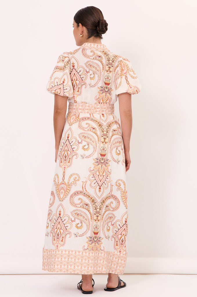 The Sarafina Linen Maxi Shirt Dress is made from 100% linen and features an exclusive adorne print. Designed with a button-down front, it has a contrast print collar, placket, waist tie, and hem. Finished with self-covered buttons and short puff sleeves with elasticated cuffs.