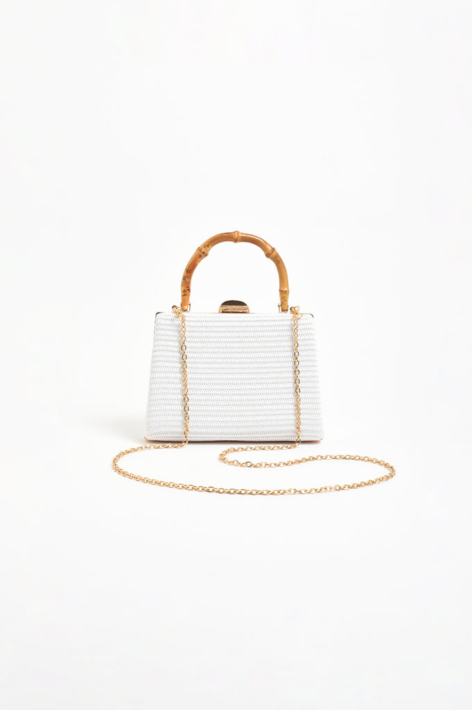 The Bamboo Handle Weave Small Bag in White features a structured woven exterior with a bamboo top handle and a clip closure. Includes an optional chain strap for versatile styling.