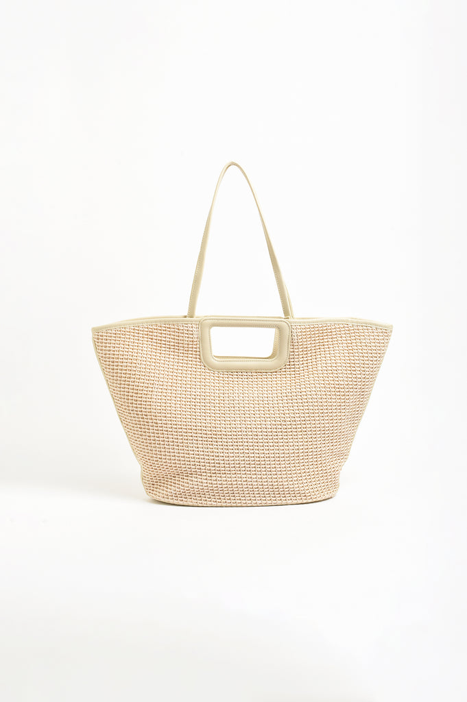 The Chunky Weave Tote Bag in Cream features a textured woven exterior with a magnetic snap closure and flat base. Designed with an internal pocket and optional shoulder straps for versatile wear.