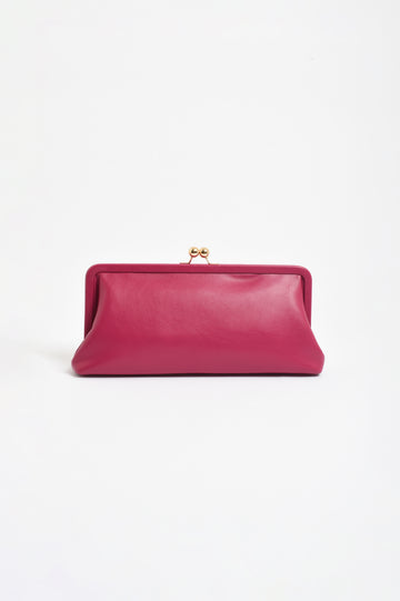 The Clip Top Soft Rectangle Clutch in Magenta features a sleek rectangular design with a clip closure. It includes an internal pocket and an optional chain strap, crafted from vegan leather and plated metal.
