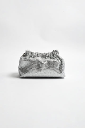 The Elena Gathered Diamante Mini Bag in Silver is a mini event bag with a magnetic closure, internal zip pocket, and slinky chain. Crafted from mini diamante for a polished finish.
