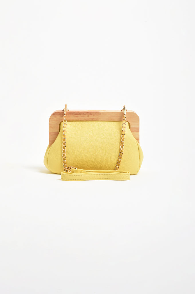 The Kimmi Timber Frame Clutch in Yellow features a timber hinge closure and an optional chain strap. Crafted from textured vegan leather and timber for a structured finish.