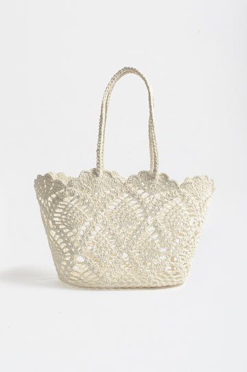 The Patterned Weave Basket Tote in Ivory is a structured basket bag with an open top and long straps. Featuring a crochet floral pattern, it’s crafted from man-made materials.
