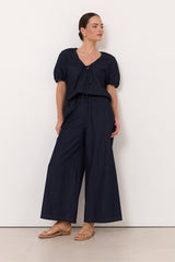 The Maura Lightweight Denim Top in Dark Denim is crafted from lightweight denim and features a relaxed silhouette. Designed with a V-neckline and front self-tie, short sleeves with elastic cuffs, and angled seamlines through the bust for subtle shaping.