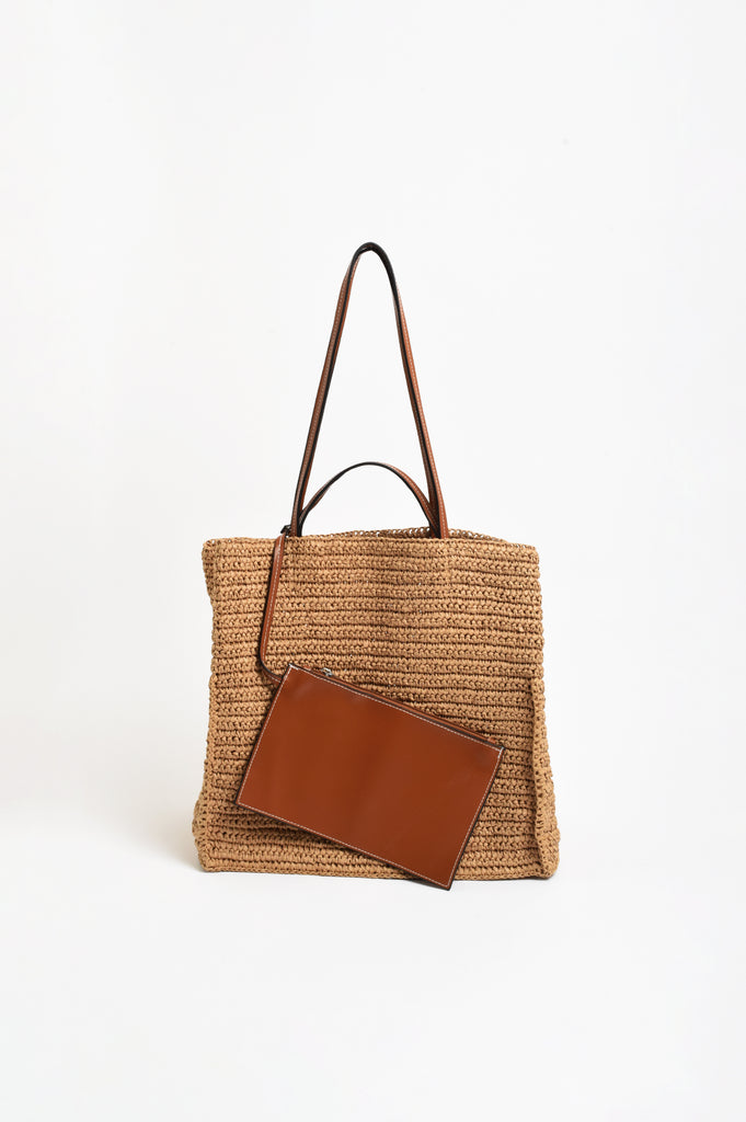 The Semi Structured Woven Tote in Camel/Tan is crafted from woven paper raffia and features vegan leather straps and handles.
