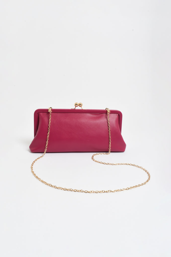 The Clip Top Soft Rectangle Clutch in Magenta features a sleek rectangular design with a clip closure. It includes an internal pocket and an optional chain strap, crafted from vegan leather and plated metal.