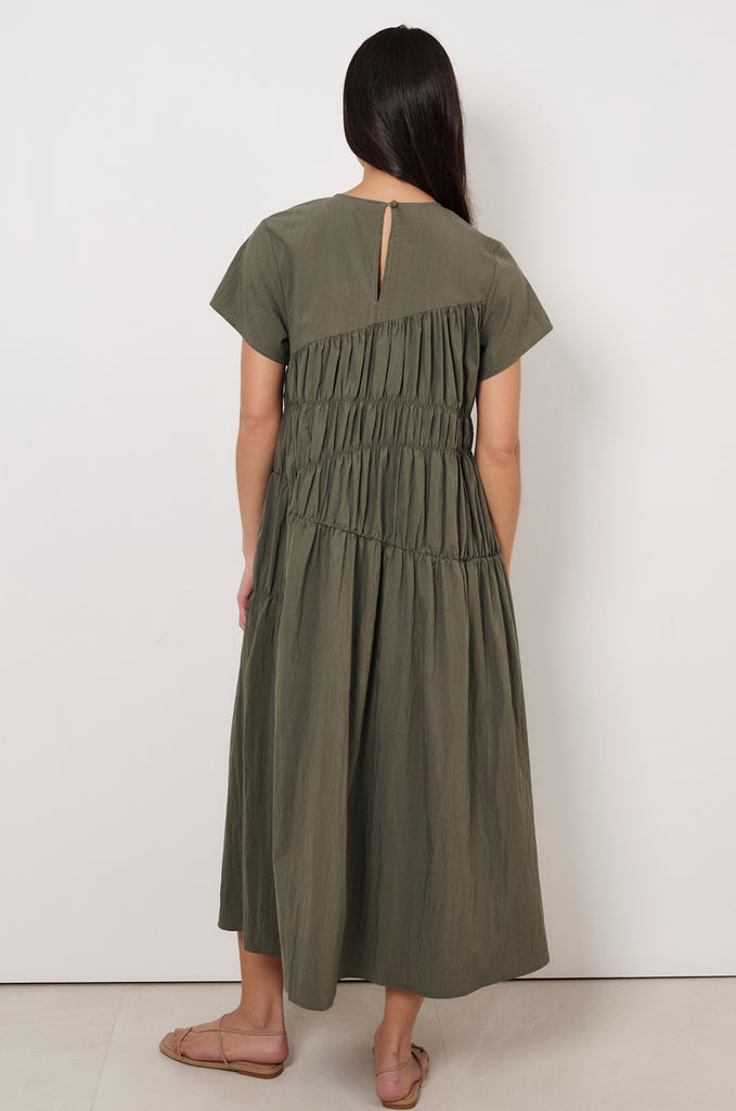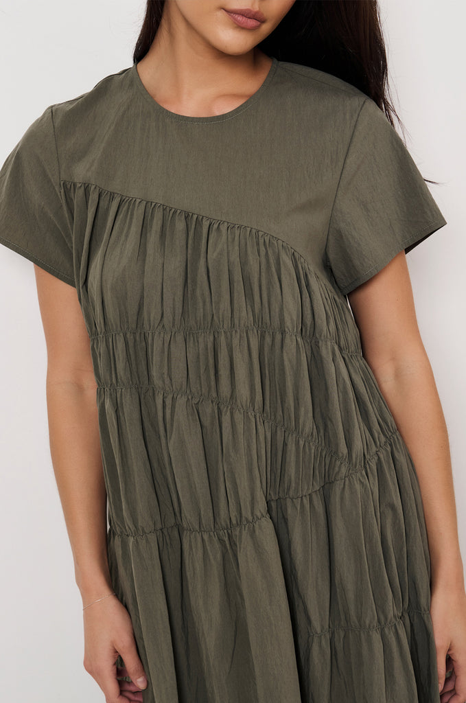The Evren Cap Sleeve Midi Dress in Khaki is made from a soft crinkle fabric. It features a round neckline, short sleeves, and gathering through the bodice, finished in a relaxed silhouette.