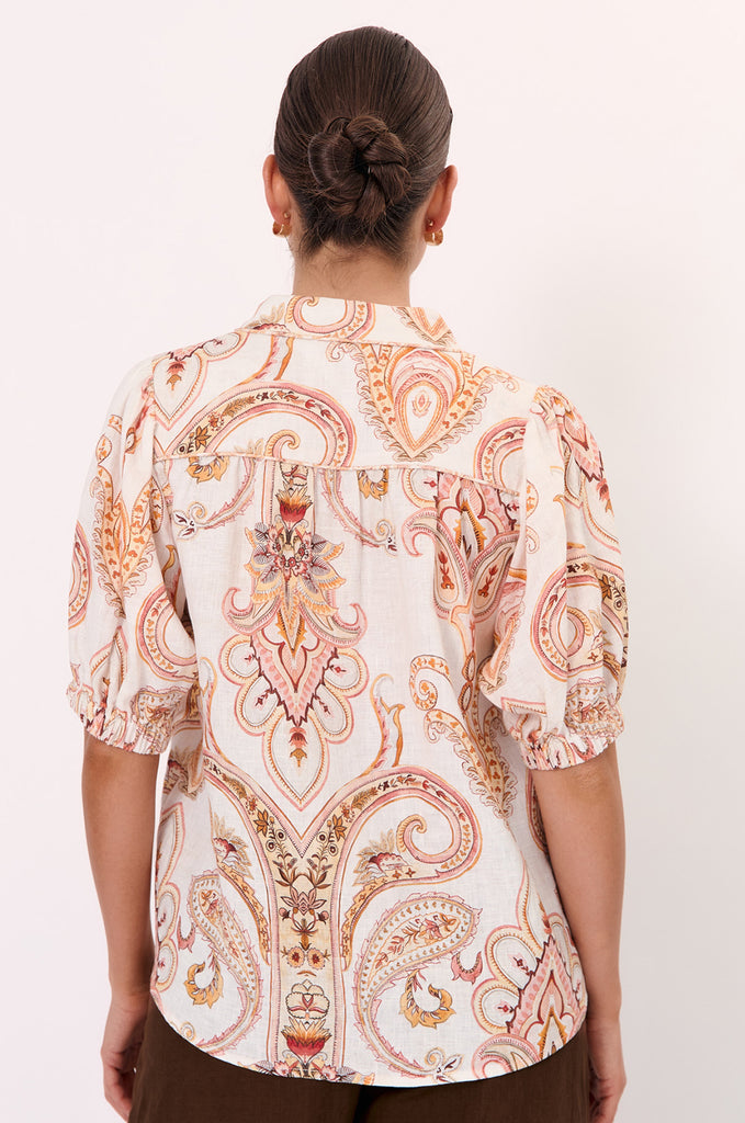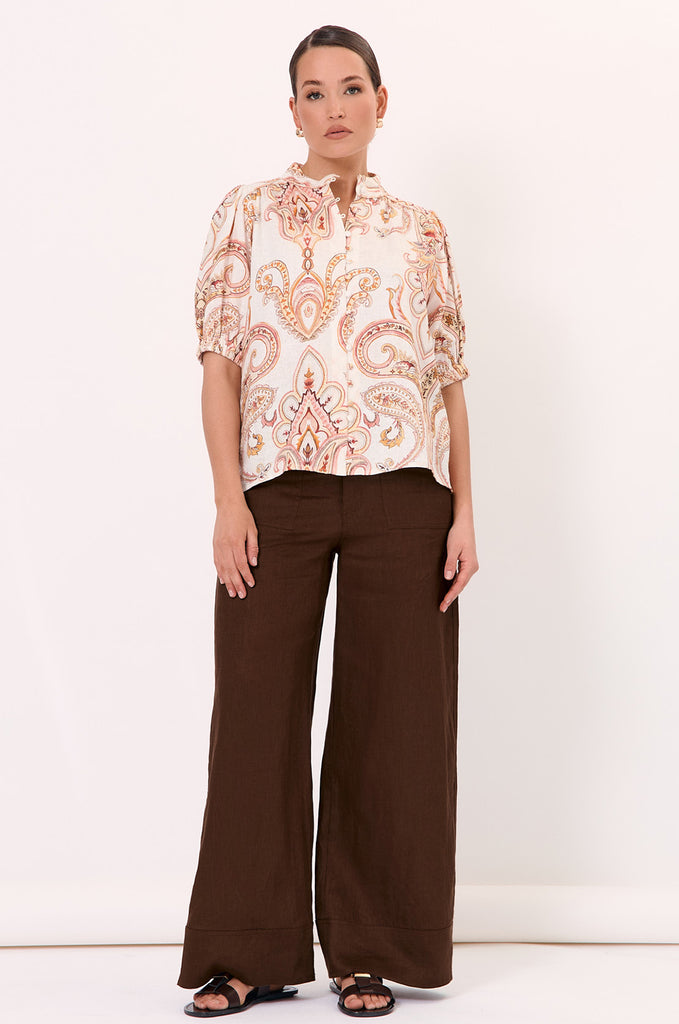 The Lilian Short Sleeve Linen Top is made from 100% linen in an exclusive adorne print. It features a mandarin collar, self-covered button-down front, and short sleeves with elasticated cuffs. Finished with a back yoke and a relaxed fit.