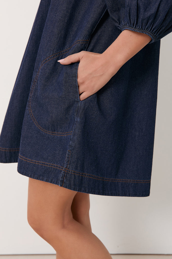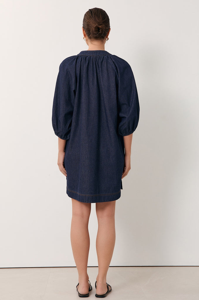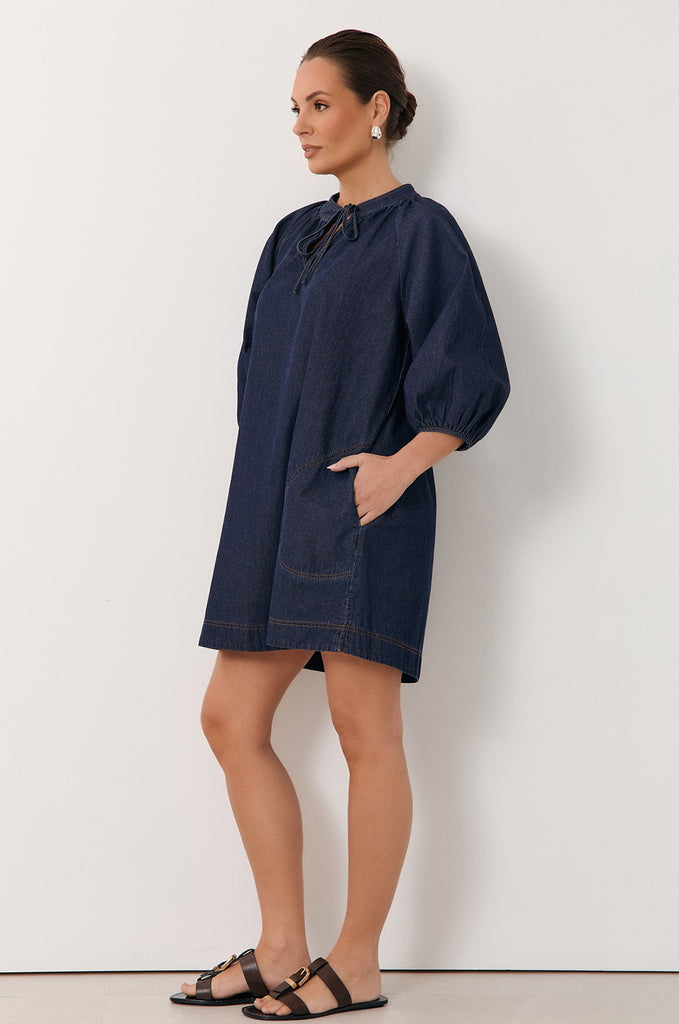 The Mabel Lightweight Denim Short Dress in Denim is crafted from a cotton blend with contrast stitching. It features a V-neckline with tie closure, long puff sleeves with elasticated cuffs, and side seam pockets, made from lightweight denim.
