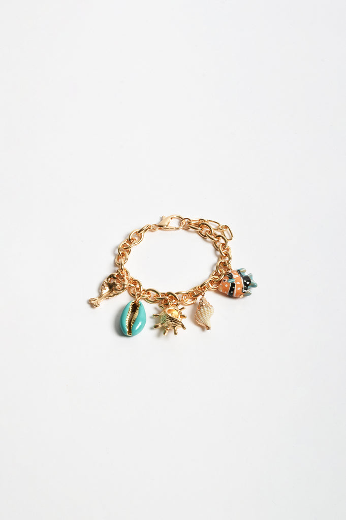 The Metal Mix Charms Bracelet in Multi features a chain-link design adorned with ceramic and enamel charms. Finished with a parrot clip closure, it’s crafted from shell, ceramic bead, enamel and plated metal.